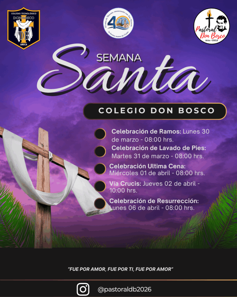 El Colegio Tecnológico Don Bosco de Arica invita a toda la comunidad educativa y pastoral a participar en las celebraciones de Semana Santa 2026, en el marco del aniversario de los 40 años de diócesis anunciando con San Marcos la buena nueva de Cristo.